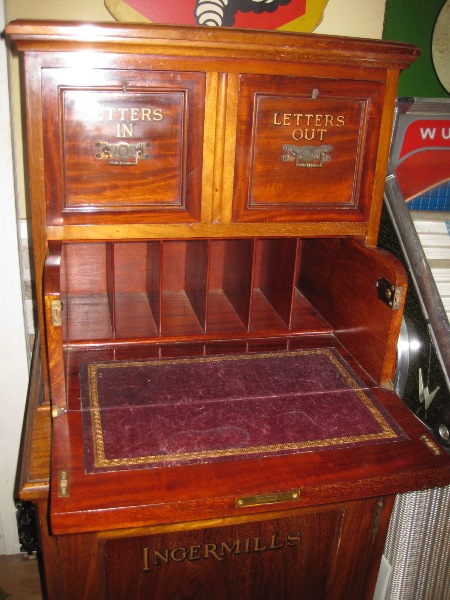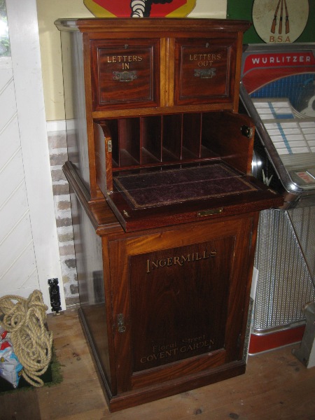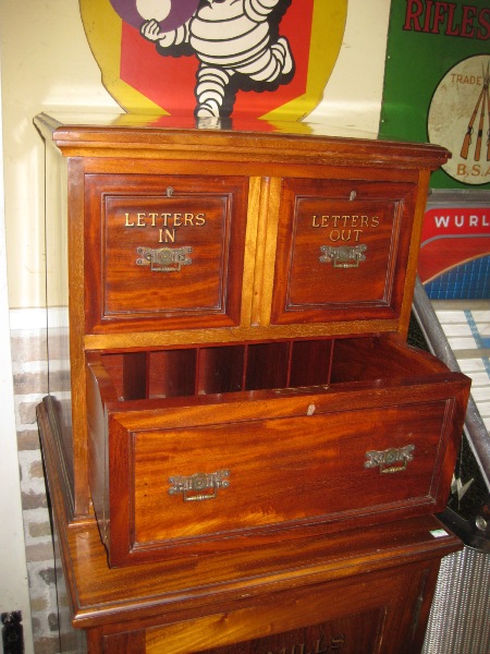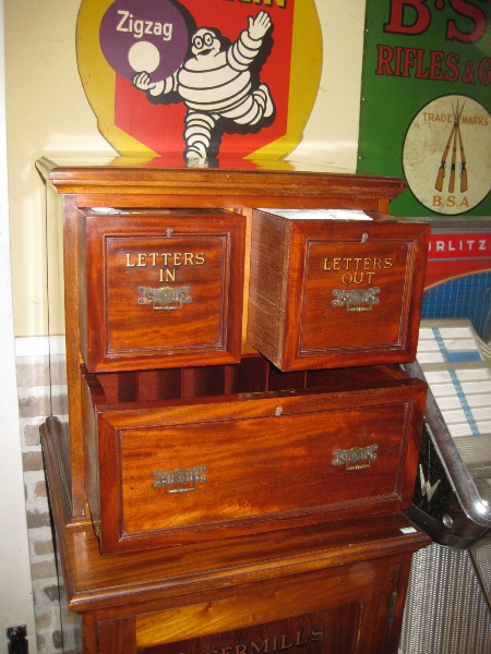 重厚感がありつつ、文字や作りが個性的なキャビネット。郵便物の整理用に使われていたようです。デスクになる中央部分は、折りたたんで押し込み、引出のように収められる作り。「LETTERS」の文字や、凝った装飾の引手も目を引くポイントです。土台になる収納は全体が使えるボックス状のため、かなり大きな物でも収めることが可能。書斎や、ショップのディスプレイとしても絵になるキャビネットです。