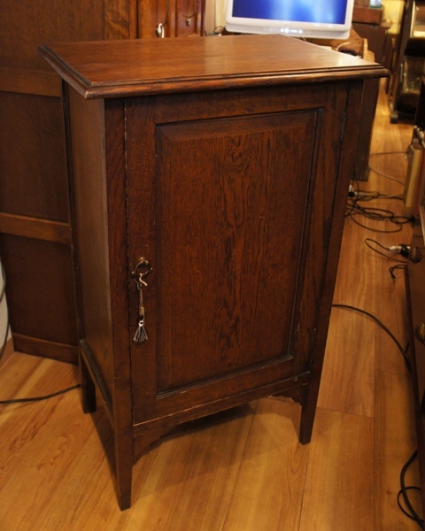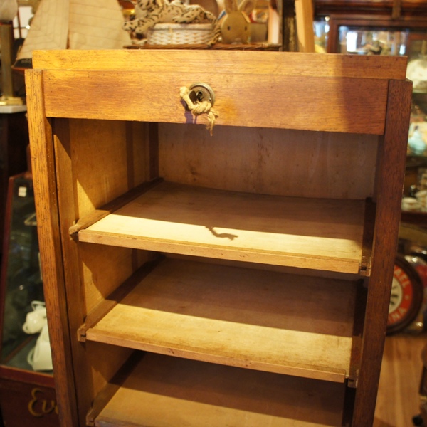 シンプルで飽きのこないスタイル。中は棚になっていて、収納力もしっかりあります。オークの木目とシックな色合いもあじわいがあり、落ち着いた雰囲気。装飾のある小さな輪のツマミと、鍵が付いています。