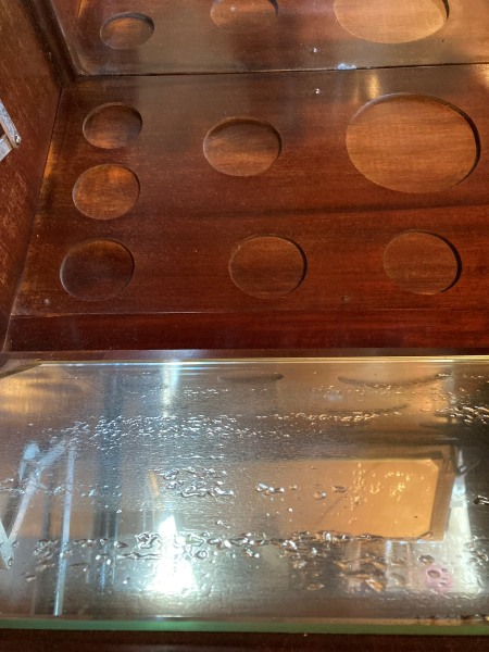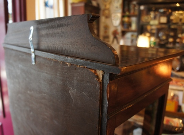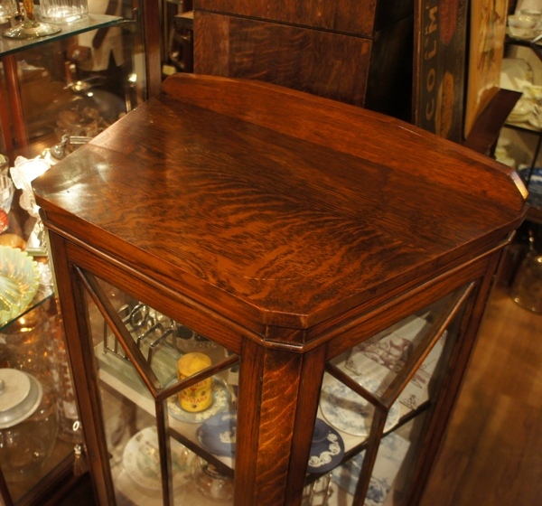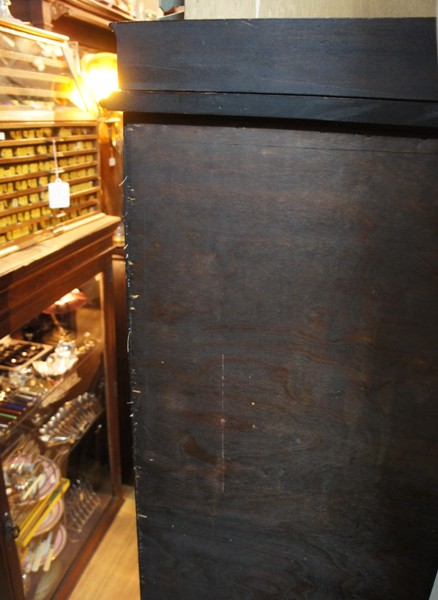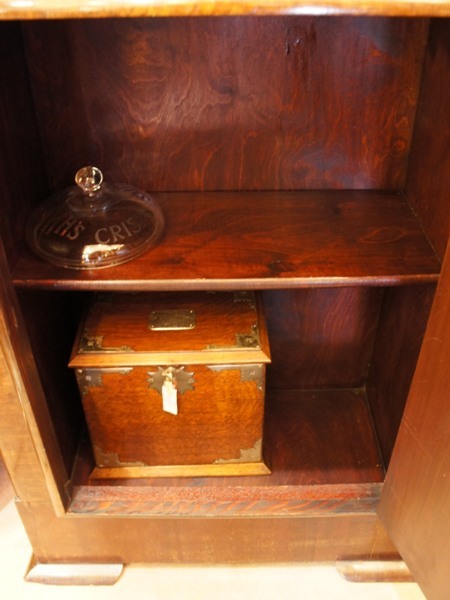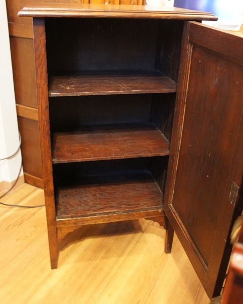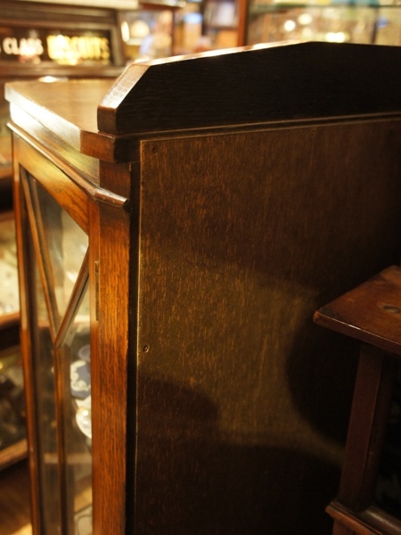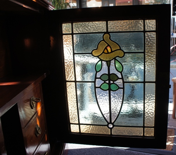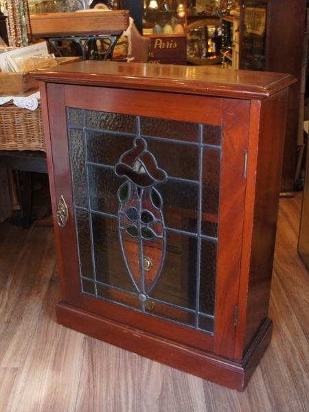 ステンドのガラス窓が渋いながらも圧倒的なかっこよさ。オーク材の表情も重厚感があります。一段ごとに分かれる作りで移動が楽な優れもの。ガラス部分はヒビがあったり、ガラスが外れた部分があったため修理していますが、ややへこんだ面や、ガラスに僅かな隙間のある箇所があります。ツマミは元のオリジナルではないようです。