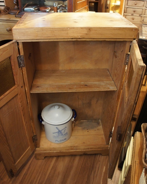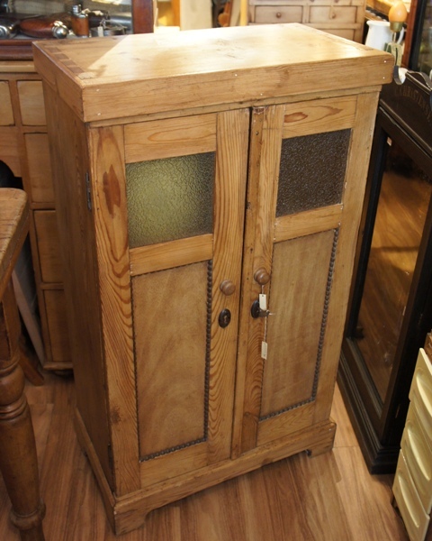 細かなおうとつで表情のあるガラス扉が個性的。おそらくキッチンでの収納用に使われていたと思われます。素朴な温もりのある質感が魅力。扉の開閉に不具合があったため、現行品の金具で修理しています。
