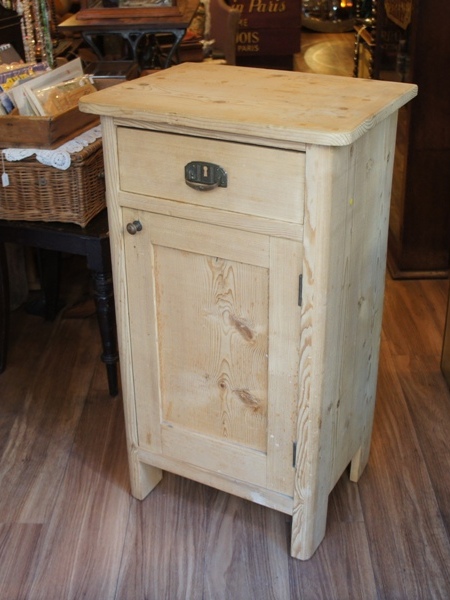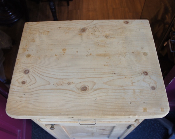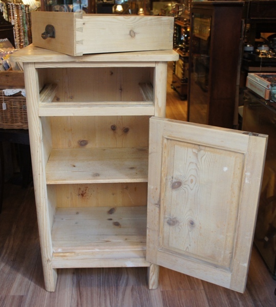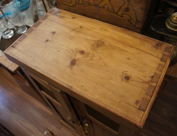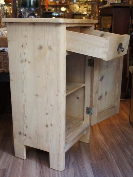 古いパイン材の表情が良い風合い。天板は折り畳んでコンパクトに、広げるとちょっとした作業台になります。台部分には大きめサイズの物も入れ、収納力もしっかりしています。