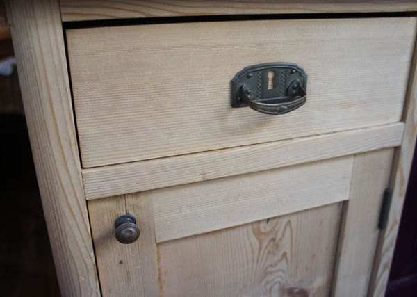 ベッドの横に置いてランプや時計など、小物の収納に使われていました。無垢の状態のためパイン家具のように見えますが、しっかりとした重さがあるためオーク材が主のようです。しゃれたデザインの引き手と、少しへこみがあるツマミは真鍮製。シンプルな作りの中で、良いアクセントになっています。天板部分に粘着テープの残りやペンの跡があります。