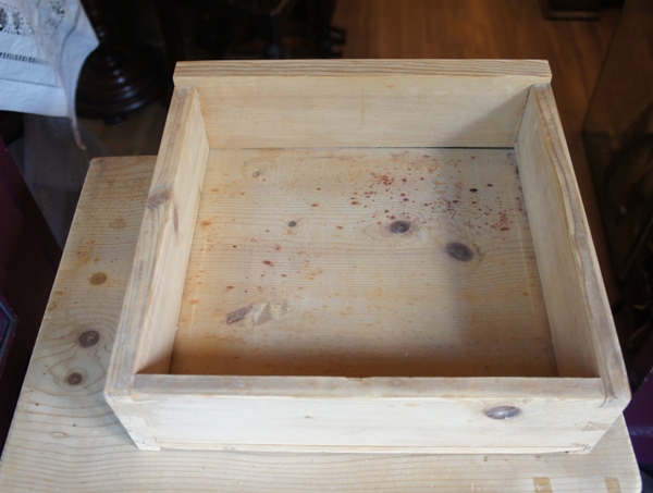 扉の文字を見ると、汚れ落とし用品の販売用ケースだったようです。素材はあまり良いものではないため、天板の表面の一部が剥がれかけて波打っていたり、落ちない染みがあるなどダメージ多め。とは言え収納力と凝ったデザインのロゴや文字は魅力的なポイントです。