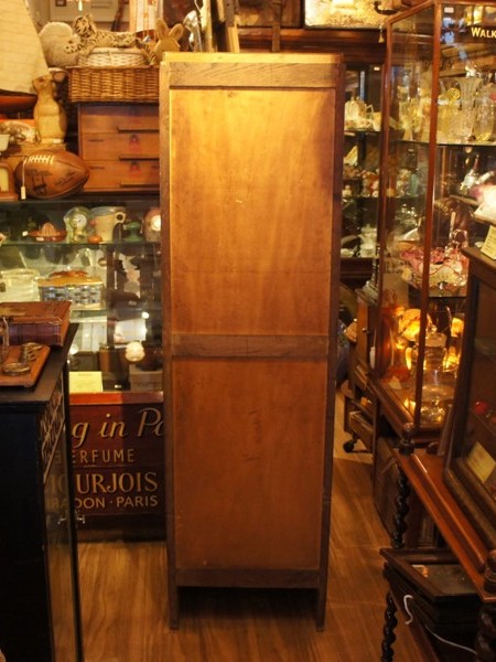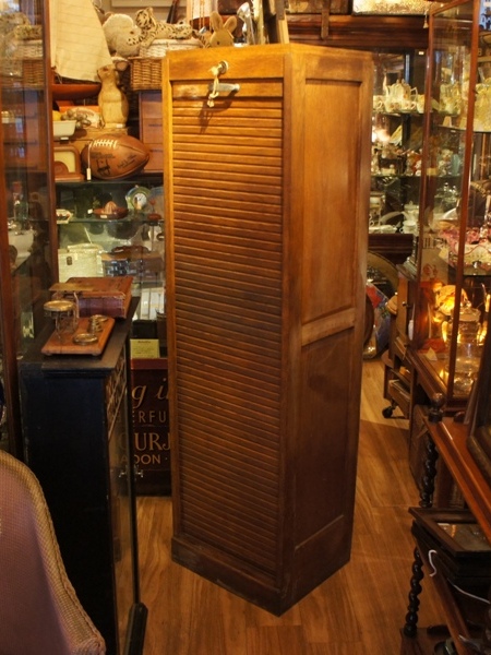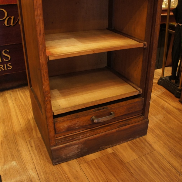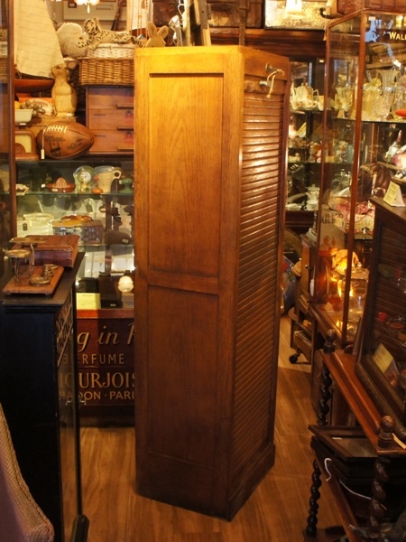 蛇腹の扉がかっこいい、オーク材の書類棚。上部の鍵を回すと一気に扉が下に落ちるため、引き手で支えながら鍵を開きます。鍵が硬いこともありますが、扉のスライドはスムーズ。中の棚は真ん中と最下段が固定、他はすべて手前に引き出すことが出来ます。棚板はややたわんでいるものがあります。表面の塗装に少し汚れ、ムラがあります。