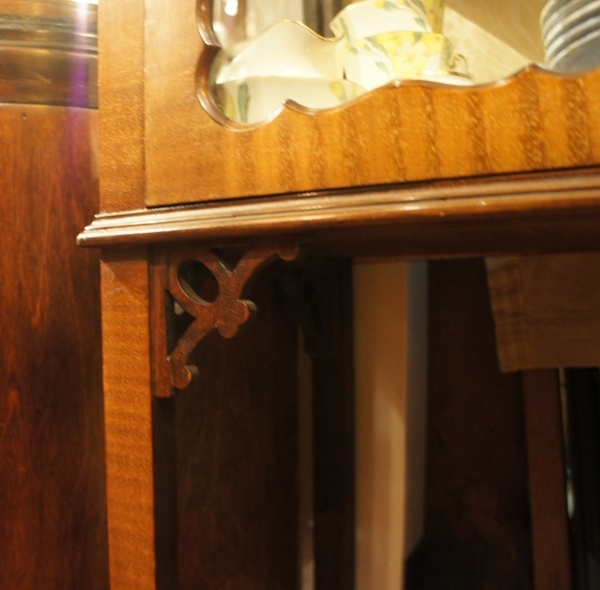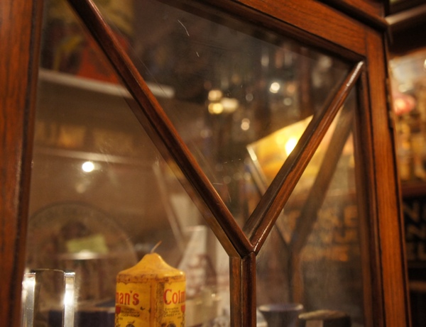 ガラス扉のフレームは品の良さを感じるシックなライン。隅々を見ても丁寧に作業されている様子が伺えます。あまり目立たない脚の部分もシンプルな猫脚で、凝って作られているのが嬉しい。中の棚板は高さが変えられます。多くの鍵付きケースやキャビネットと同様に、扉を開く際には鍵がツマミの代わりになります。向かって右側の扉の裏には、「Harrods LONDON.S.W」と書かれた楕円のプレートが付いて、特別感を感じさせてくれるポイントになっています。