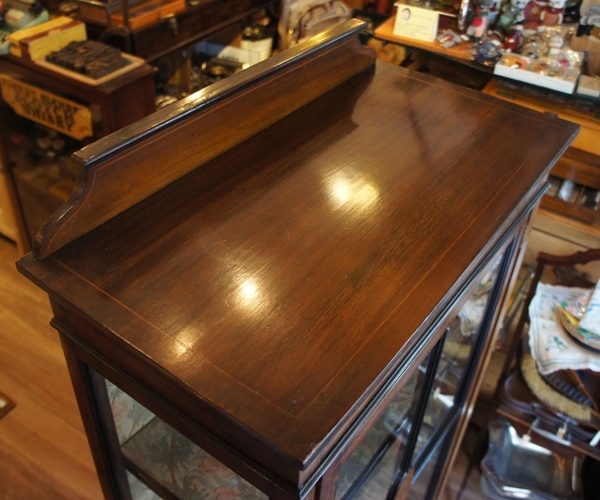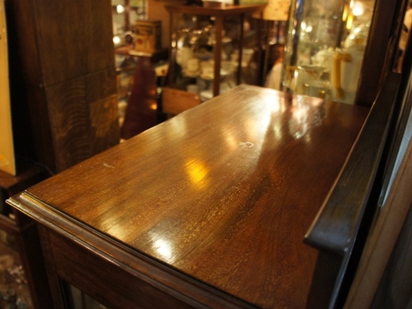 小型の卓上キャビネット。高級感のあるシックな色合いが魅力です。中の棚板は移動が可能で、高さを変えることが出来ます。裏板は新しく取り替えられているかと思われます。ガラスを固定する木製のパーツが1本ありませんが、使用には差し支えありません。