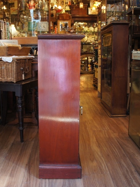 台形をした珍しいタイプ。前面はもちろん、両サイドの扉も開けしめすることが出来ます。扉のヘリや柱部分が斜めにカットされて、きちんと綺麗に閉じられる丁寧な仕事ぶり。サイズ感もシンプルなデザインも、使いやすさと上質さを感じさせてくれるアイテムです。天板にひっかき傷がありますがさほど目立ちません。鍵は3面共通で1本。鍵を回す感覚が少しだけ緩めの印象ですが、手こずる程ではありません。三段目の布に薄い汚れがあります。