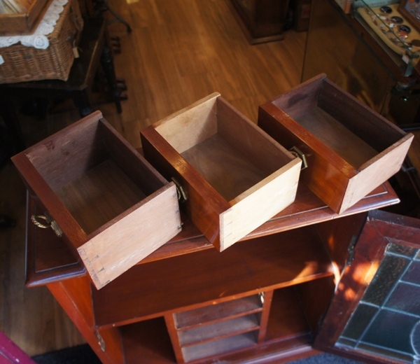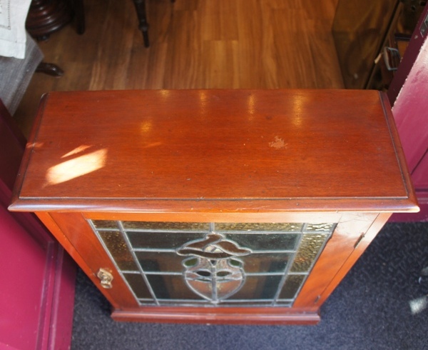 ステンドグラスが印象的な薄型キャビネット。壁掛け用にも見えますが、かなりの重さがあることと、裏面に取り付けた形跡がないため、卓上に置かれたいたのかもしれません。扉のステンドグラスは丸みのあるかわいらしい花のデザイン。葉と茎の部分は引き出しのツマミが当たらないような作りのためか、やや膨らんでいる細やかな作り。鍵穴はありますが鍵はありません。ツマミをドアノブのように回して開きます。やや固めです。上の小引き出しは全部引き出す際、かなり固め。他の2つはスムーズです。