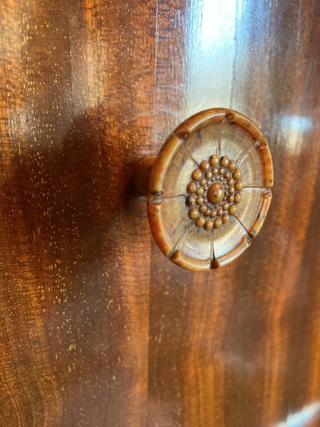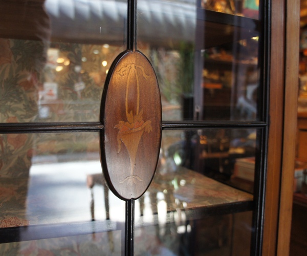 品のあるすっきりとしたシルエットが美しい。天板や扉の周り、脚の部分に細く入ったラインは全て象嵌によるもの。目立たない装飾にも手を抜かない繊細な仕事ぶりがうかがえます。扉中央の楕円形の部分には、シンプルな花籠の象嵌。全体の雰囲気にあった控えめな図案がよく馴染んでいます。中の布はウィリアム・モリスのアネモネ。近年、張り替えられたようです。脚の角の部分の傷や表面の色ムラがあります。特別目立つ印象ではありません。扉の開閉には鍵がツマミ代わりになります。鍵の開閉には少し加減が必要ですが、機能には問題ありません。