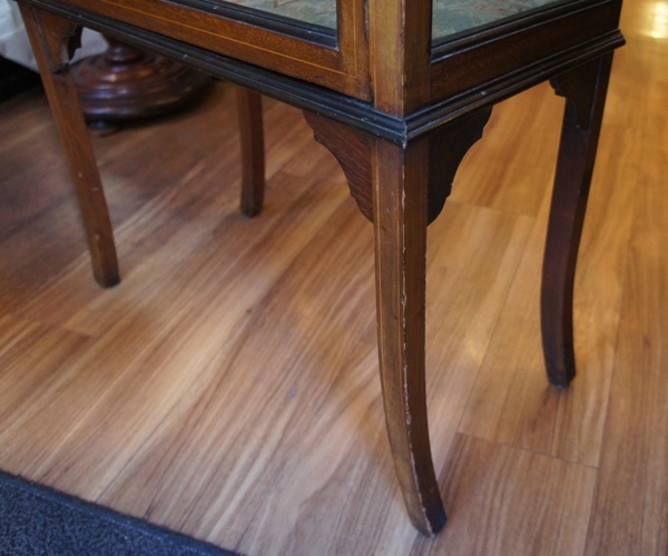 直線的なシルエットと、ガラス扉を囲む波打つようなラインのコンビネーションが個性的。上部の装飾も波を表しているかのようなモチーフです。脚が長めのため、下の段が見やすくなっているのも使いやすさのポイント。扉に鍵穴がありますが鍵は付いておらず、金属製のツマミで開閉します。程よい摩擦があるのできちんとおさまります。中の布は数カ所ですが気泡のように浮いていたり、薄いシミが広がっている箇所があります。ひどいダメージではありません。