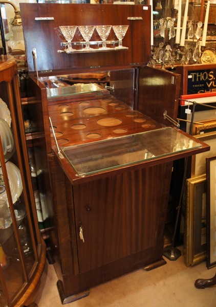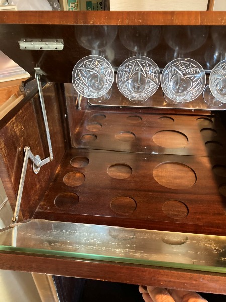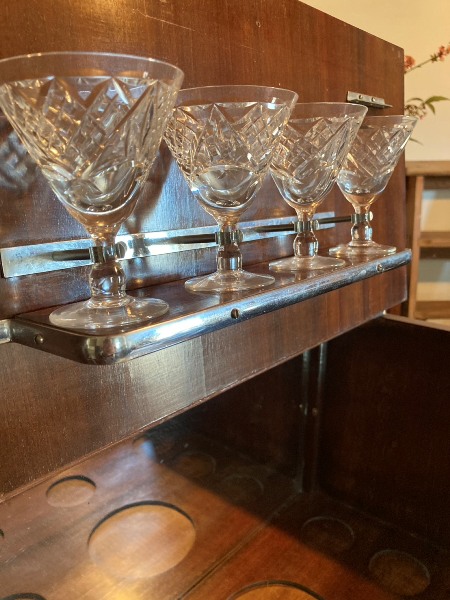 直線的でシンプルなラインが特徴的なアールデコデザイン。前面上部のつまみを手前に引くと、天板も同時に開き上がる面白い作り。もとはカクテルを作る為の道具や容器などがセットされていたと思われますが、買付時には欠損状態でした。オリジナルかは不明ですが、グラスはぴったりのサイズの物がセットされています。お酒のボトルが余裕で入る収納力も魅力。