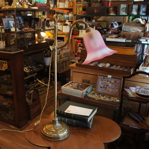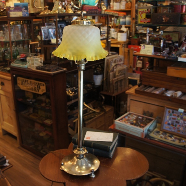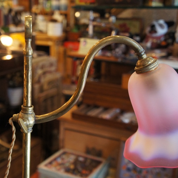 真鍮のランプベースはガス灯として使われていたもの。チェーンの付いたレバーが、ON・OFFのスイッチでした。シェードの口径が広いのもその特徴です。直線的でシンプルなデザインも魅力的。高さがあり、空間によく映える優雅なランプです。修理済。