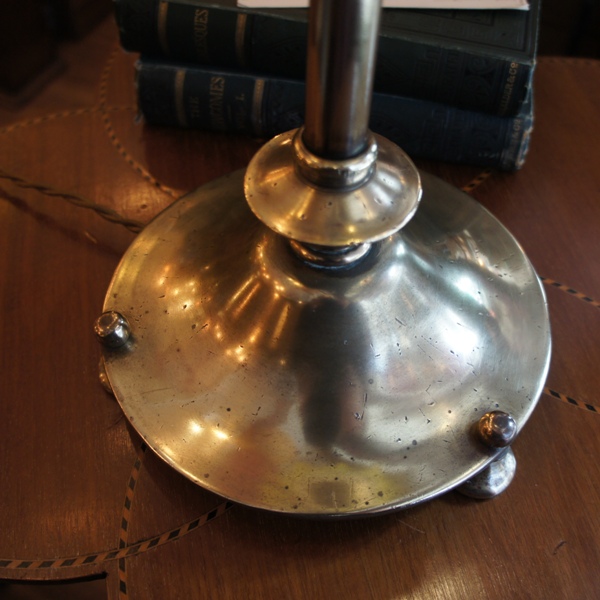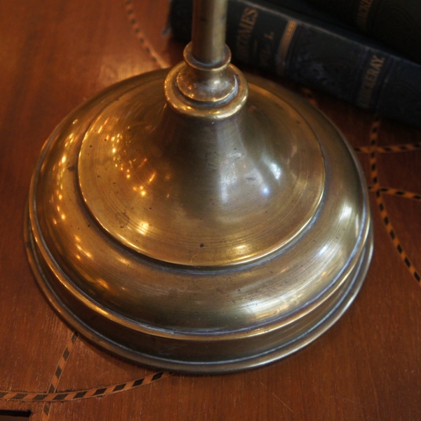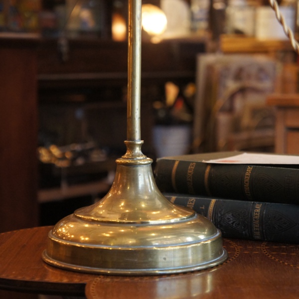シンプルなデザインのベースは、重厚さを感じさせる質感の良い真鍮。支柱が通常のタイプよりも長く、大ぶりのシェードがバランスよくまとまっています。台座のパーツの丸みがかわいらしいアクセント。パーツ、支柱ともにやや傾きがありますが、安定感に問題はありません。未修理。