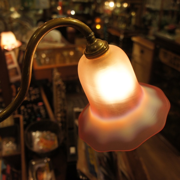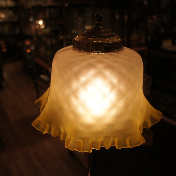 程よい豪華さのあるベースは、金色のペイント。台の後ろ側、突き出した脚が一ヶ所欠けたため、接着修理した跡があります。シェードは動きのあるフリルが印象的なオパルセントガラス。ベースとのバランスもぴったりです。